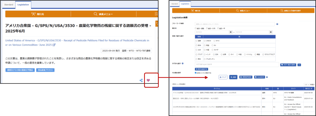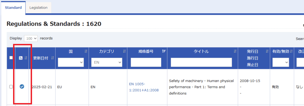 Standard画面に掲載されている各種規格・法規についても、その有効/無効状態や改正有無等の情報が、