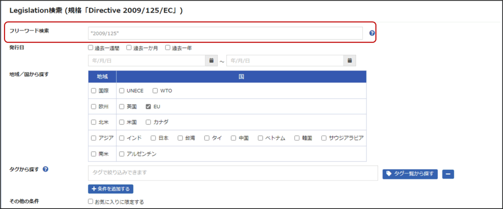 検索ワードでは、指令や規則の番号で情報を抽出することができます。