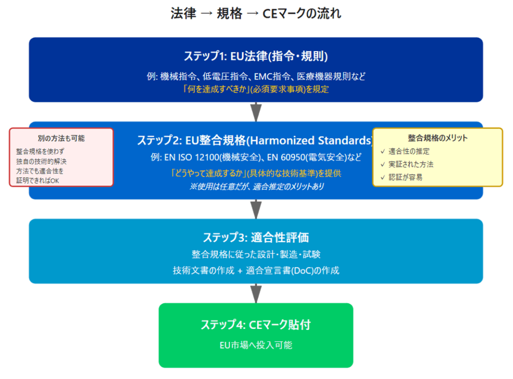 EU市場で製品を販売する際には、該当するEU指令(例:機械指令、低電圧指令、EMC指令など)の要求事項を満たす必要があります。しかし、これらの指令は「何を達成すべきか」という目標だけを示しており、「どうやって達成するか」という具体的な方法は示していません。