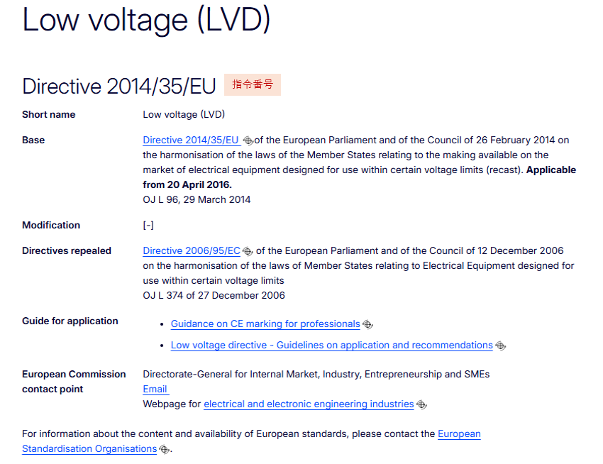 | 低電圧指令(LVD) | 2014/35/EU | 電気製品の安全 |